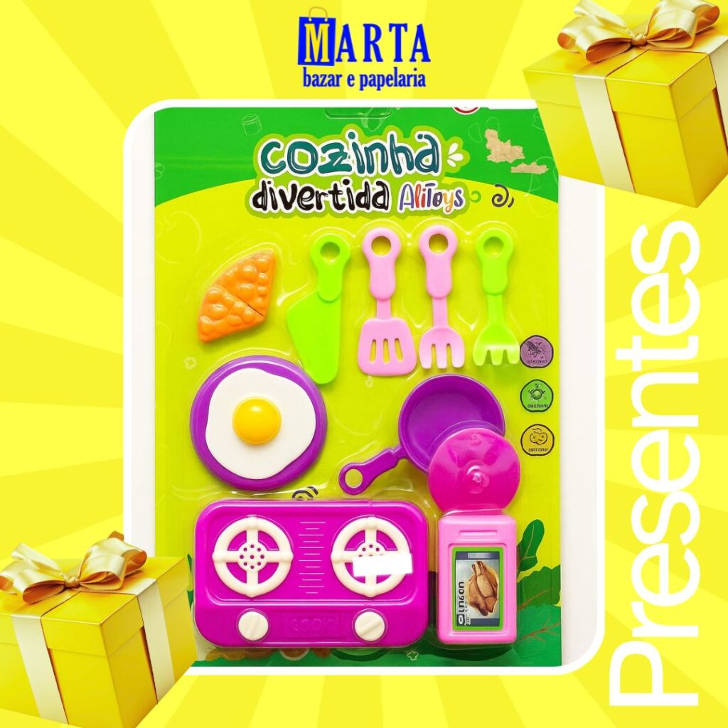 A brincadeira de faz de conta fica muito mais divertida com a Cozinha Divertida – Kit de Brinquedo Infantil, disponível na Marta Bazar e Papelaria, no Jardim Alvorada – São Paulo. Esse conjunto colorido vem com fogão, panelinhas, utensílios e alimentos de brinquedo, proporcionando horas de diversão e aprendizado para os pequenos.